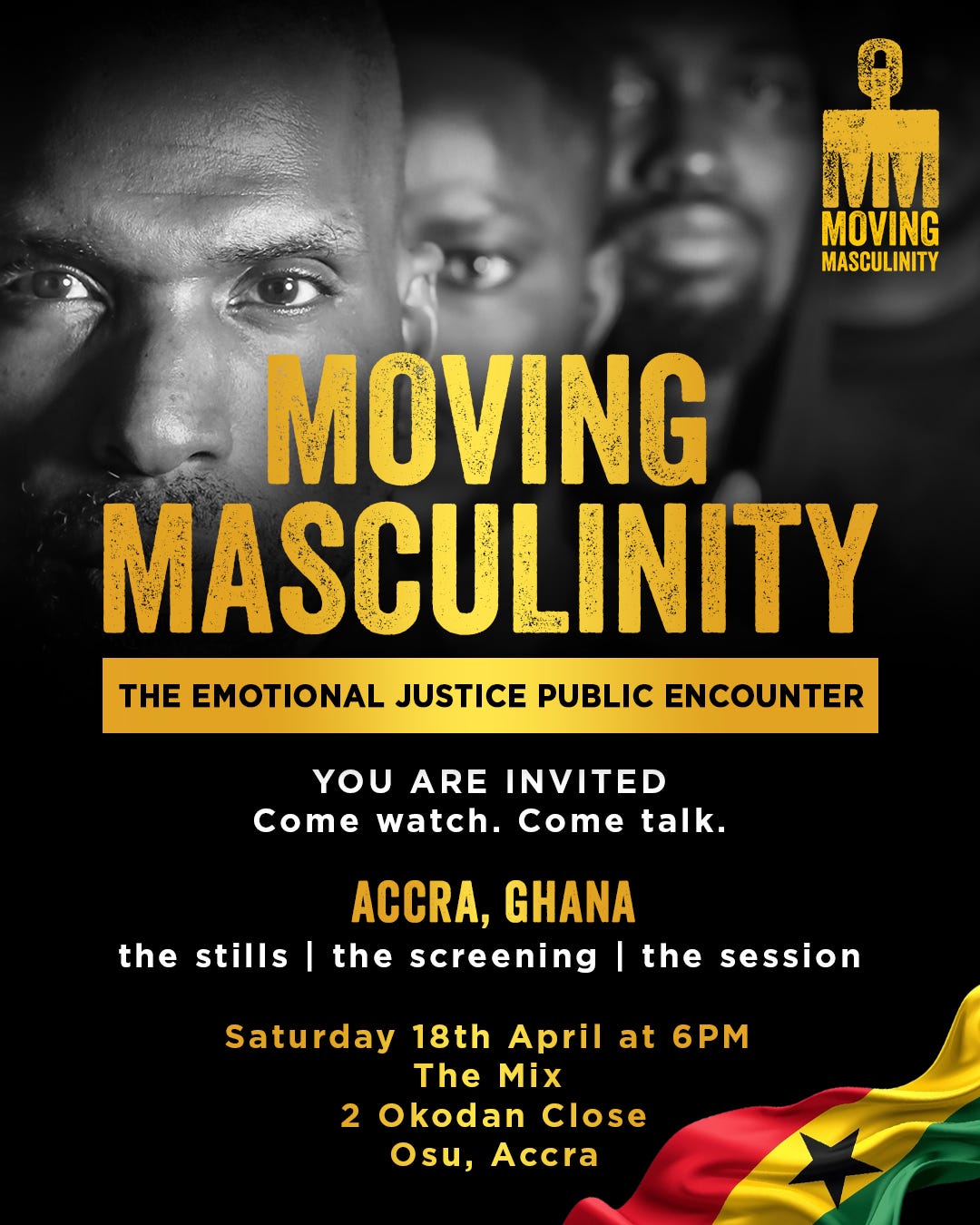 THE STILLS: The journey begins with Ghanaian photographer Alex Kwesi Afari’s photo exhibition featuring Black men in Accra in a range of emotional expressions. These stills are storytellers of emotion. They hold signs that act as invitations to action - calls to move a masculinity that has been paralyzed and pathologized toward one of possibility, peace-building and emotional literacy.